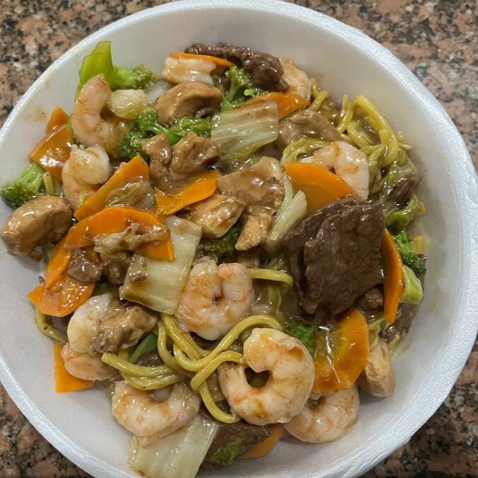Carne, frango e camarão, macarrão, acelga, brocolis e cenoura