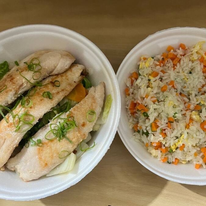 Arroz Gohan , Yakimechi e Legumes , Tilápia grelhada em pedaços