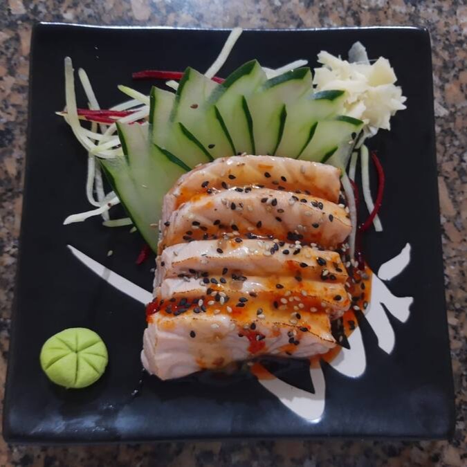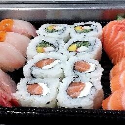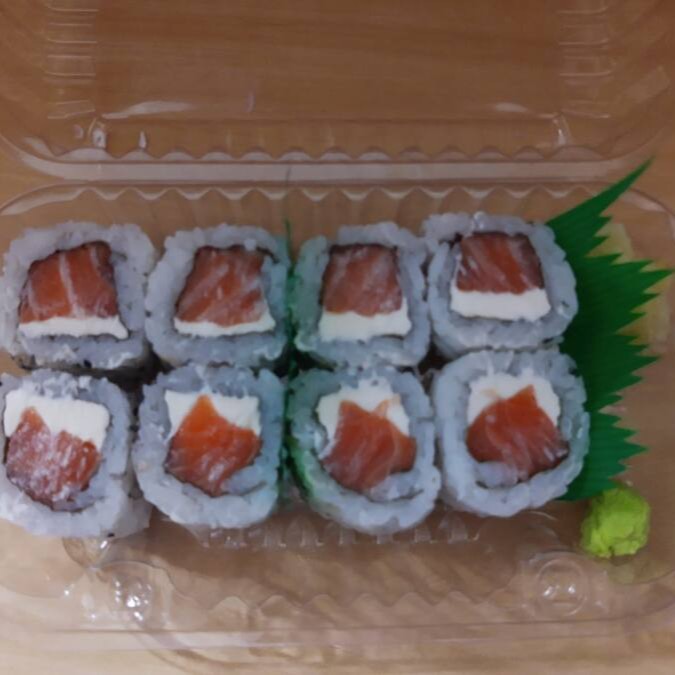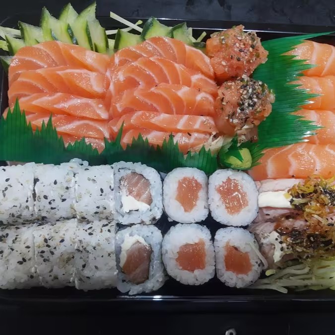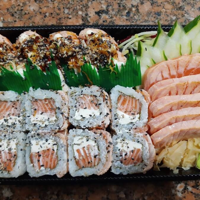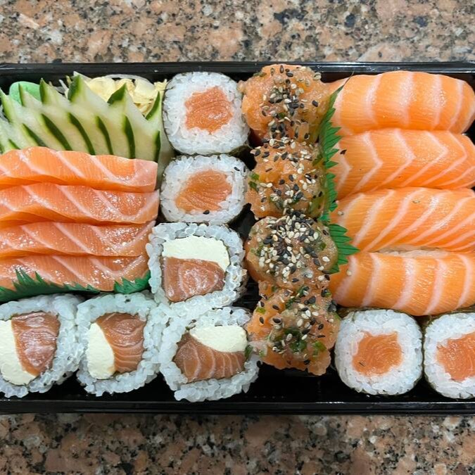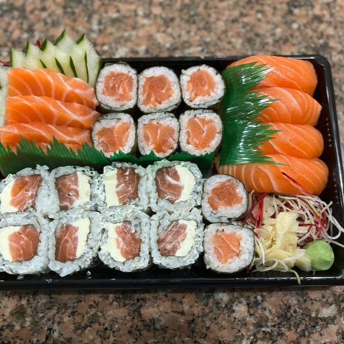 4 Niguiri de Salmão, 4 Sashimi Salmão, 4 Uramaki Filadélfia, 4 Hossomaki de Salmão, 4 Gunka.