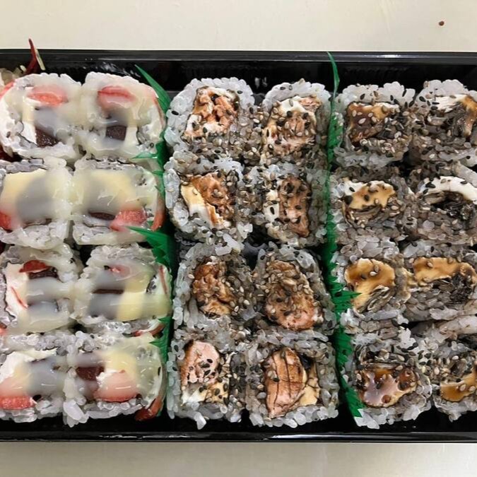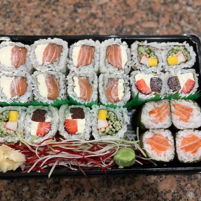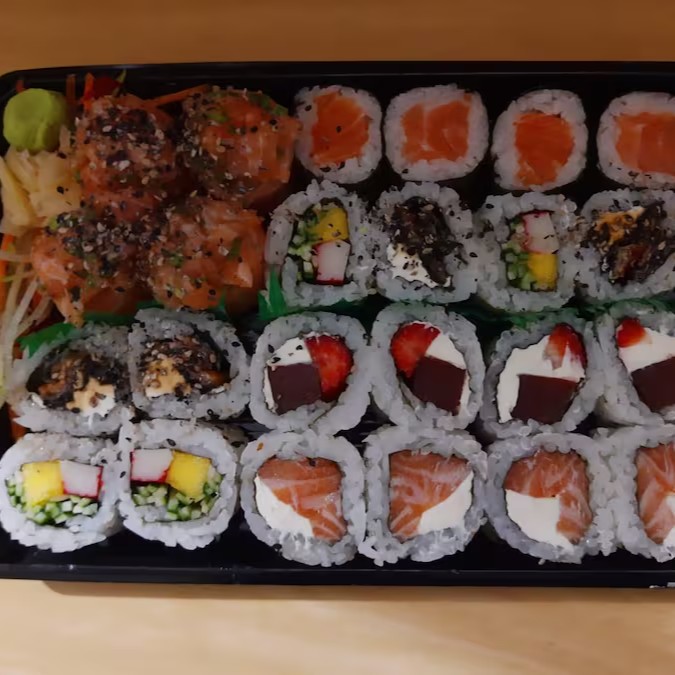 24 peças: 4 Uramaki Filadélfia, 4 Uramaki Romeu e Julieta, 4 Uramaki Califórnia, 4 Uramaki Skin, 4 Hossomaki, 4 Gunka