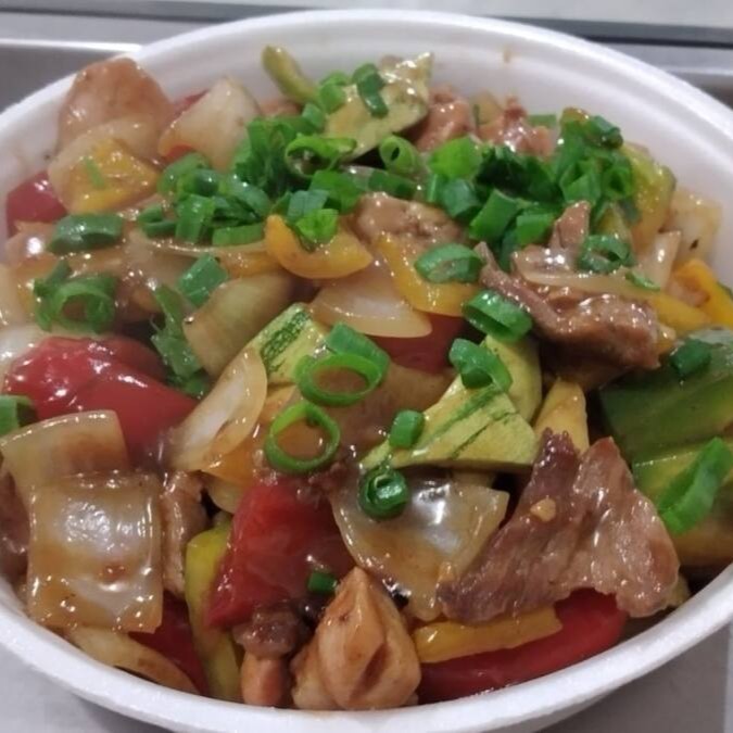 Frango, acelga, brocolis, cenoura, pimentão e cebola