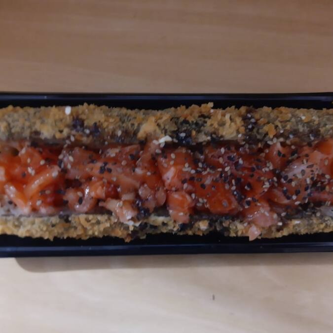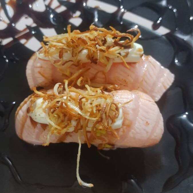 Arroz, salmão flambado, cream cheese e crispy de alho poró