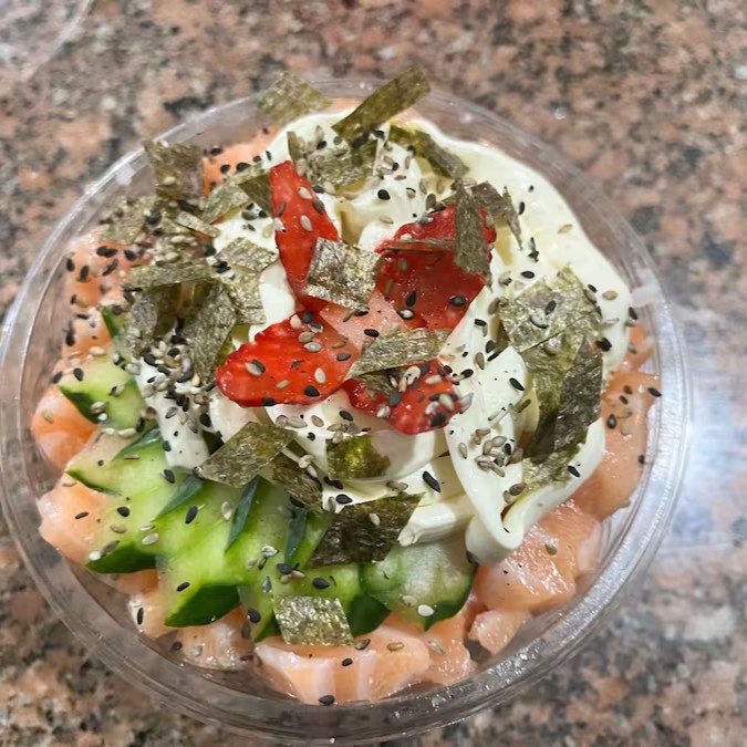 Salada com pepino , tomate , cebola roxa e Salmão em cubos