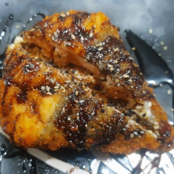 Arroz , fatia de pele grelhada por cima, molho tarê