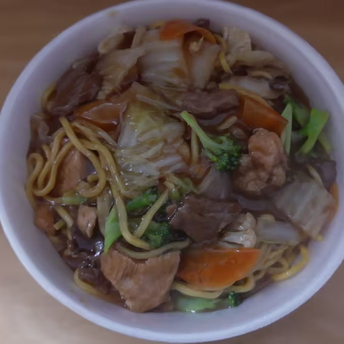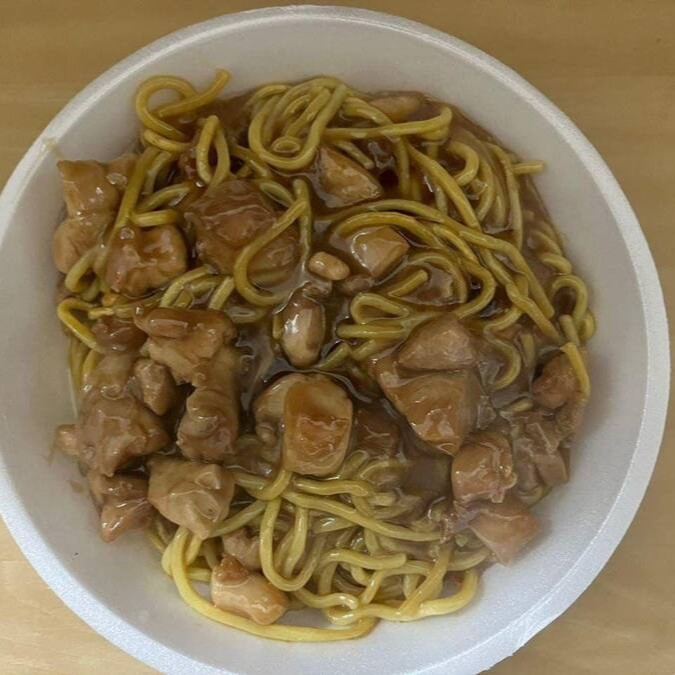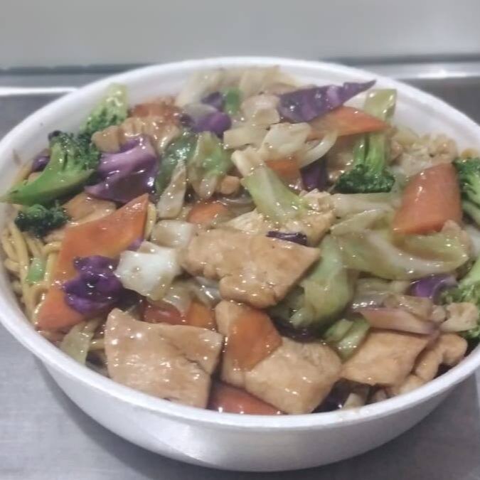 Frango,Macarrão,molho oriental e legumes ( Acelga , brócolis , cenoura e couve flor).