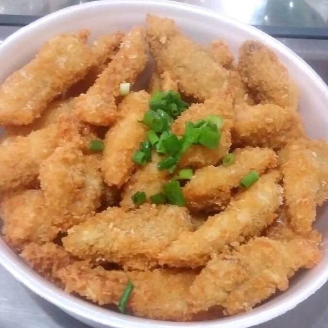 Tilápia cortada em pedaços e colocado na farinha panko e frito