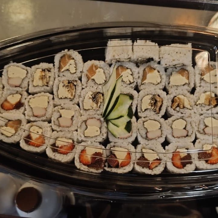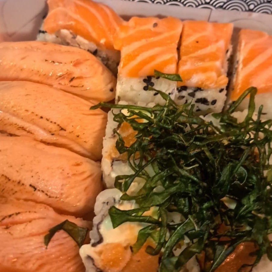 com 8 Uramakis Filadélfia, 8 Uramakis Califórnia, 8 Uramaki Skin, 8 Uramakis Romeu & Julieta, 8 Uramaki Filadélfia Grelhado e 2 Niguiris Salmão