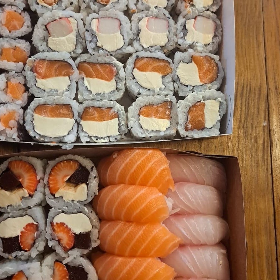 8 uramaki filadélfia, 8 uramaki skin, 8 uramaki romeu e julieta, 8 hossomaki salmão, 8 uramaki kani kama, 6 niguiri salmão, 6 niguiri tilápia