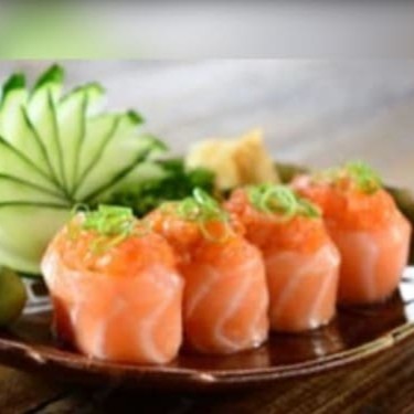Urumaki de salmão e cream cheese, enrolado no arroz coberto com uma fatia de salmão