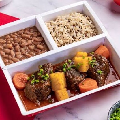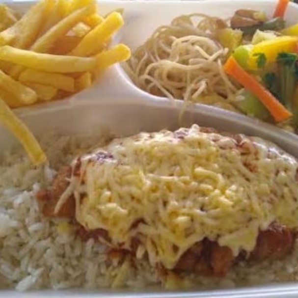 Contém - Arroz - Feijão - Macarrão ao molho - Batata rústica - Refogado de legumes - Ovo frito - Salada