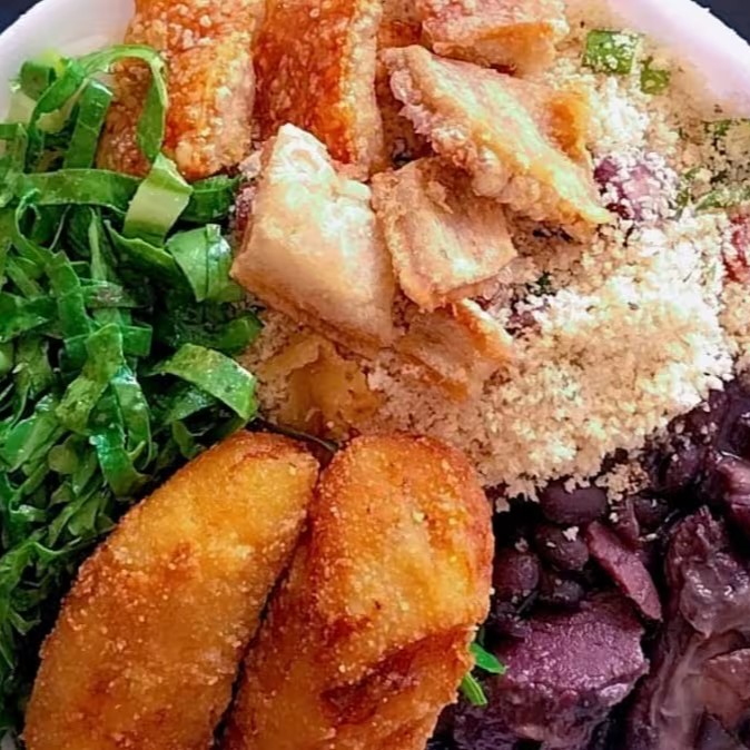 Contém - Arroz - Feijoada - Couve Refogada - Banana a Milanesa - Torresmo - Farofa especial da casa - Vinagrete