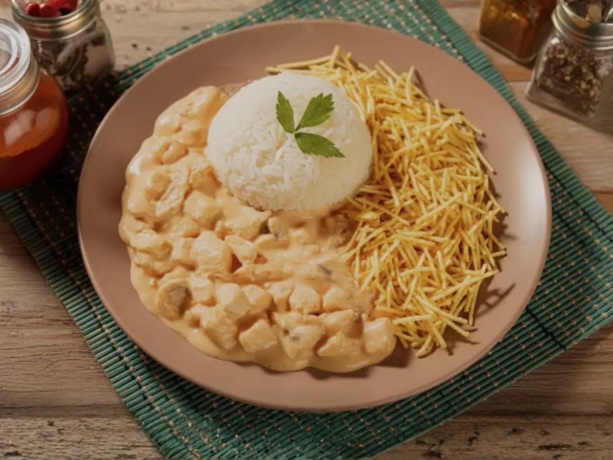 Saboreie 250g (porção do item strogonoff) do nosso tradicional Strogonoff de Frango com Champignon, misturado com uma generosa porção do verdadeiro Catupiry. Acompanha arroz branco, batata palha ou purê de batatas.