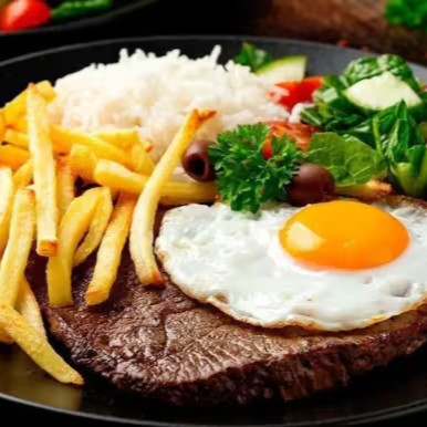 Marmita média com arroz soltinho, feijão caseiro temperado, bife suculento, ovo frito, farofa crocante e batata frita douradinha.