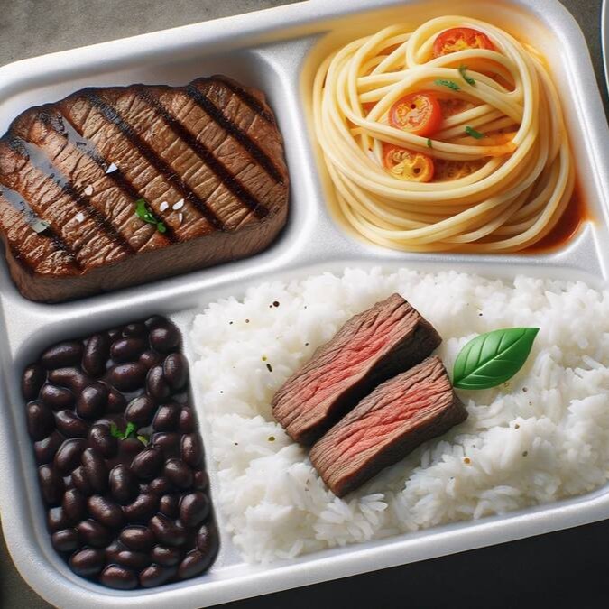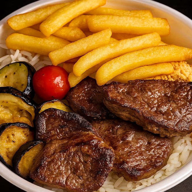 Marmita média com alcatra na chapa suculenta, arroz branco soltinho, feijão bem temperado, farofa crocante e batata frita douradinha. Sabor e equilíbrio em cada garfada. Acompanha Sprite lata
