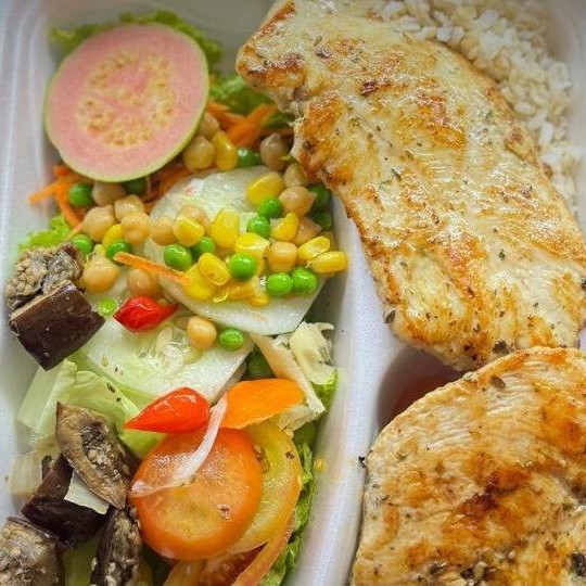 A marmita acompanha: Salada Fresca: Mistura colorida de folhas e vegetais frescos, arroz Integral, Frango Grelhado