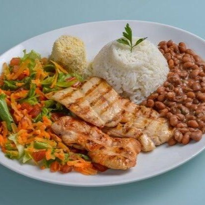 Marmita média com delicioso filé de tilápia grelhado, arroz branco soltinho, feijão temperado, farofa crocante e batata frita douradinha. Leve, saborosa e irresistível! Acompanha Sprite lata