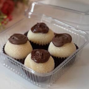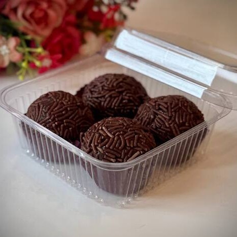 Caixinha transparente com 4 brigadeiros deliciosos feitos com chocolate nobre.