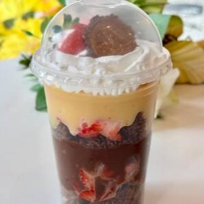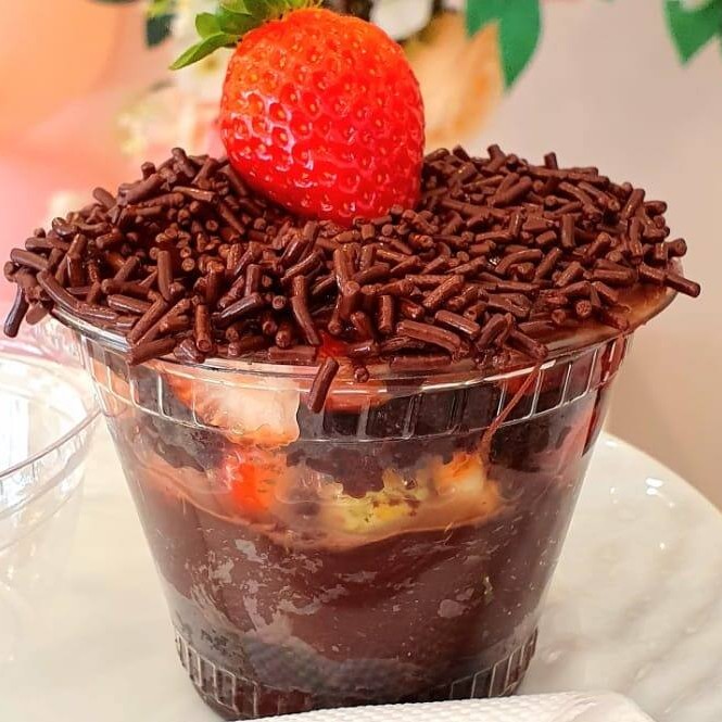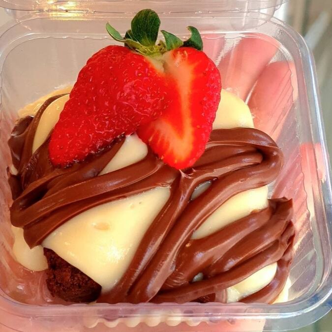 Uma base generosa de brigadeiro cremoso, feito com chocolate 50% cacau, massa de chocolate fofinha e molhadinha, morangos frescos picados e finalizado com granulado De Chocolate Puro! Esse potinho proporciona uma experiência incrível pra quem gosta de doces que não são tão doces e ama chocolate com morango.