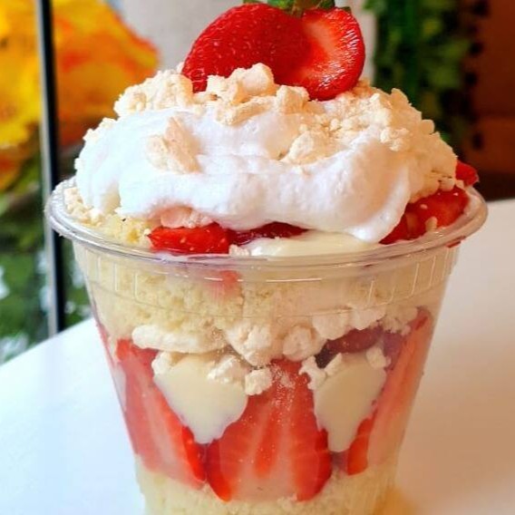 Bolo molhadinho de baunilha, creme belga, morangos frescos picados, suspiro crocante e finalizado com chantilly cremoso, huuummmmm!