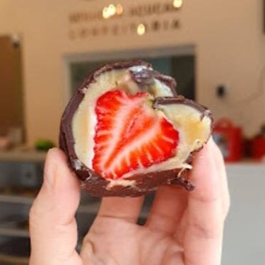 Bombom recheado com brigadeiro branco, morango fresco e com uma casquinha fininha de chocolate.