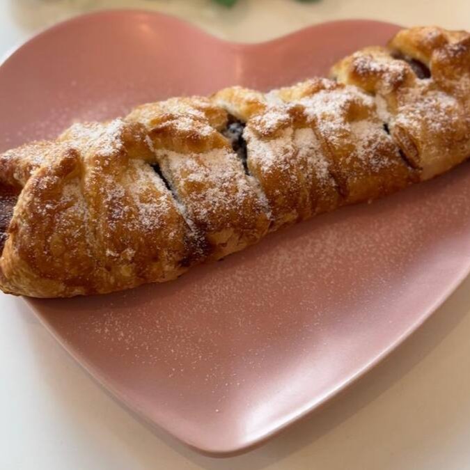Um irresistível strudel de maçã, dourado e crocante por fora, com massa folhada perfeitamente assada.
