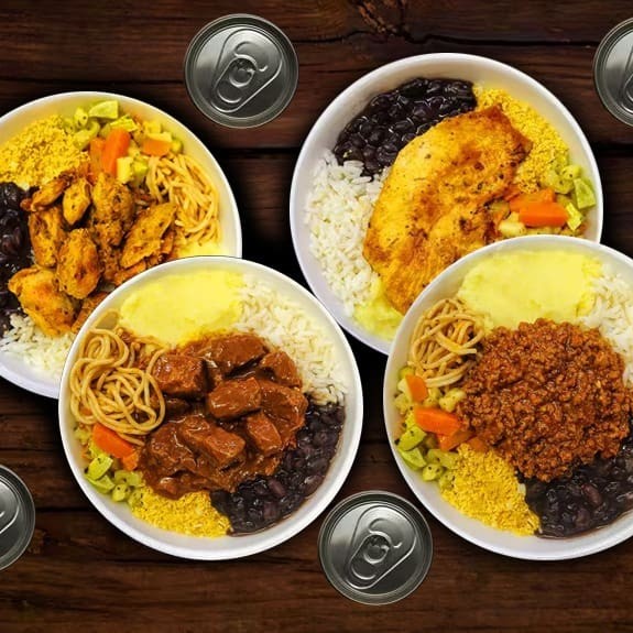 Arroz, Feijão, Farofinha temperada, Legumes do Dia, Macarrão, Purê de Batata e Carne de Panela (100g). (Peso total Aprox. 1kg). Atenção: Utilizamos Bacon no tempero do feijão e farofa.