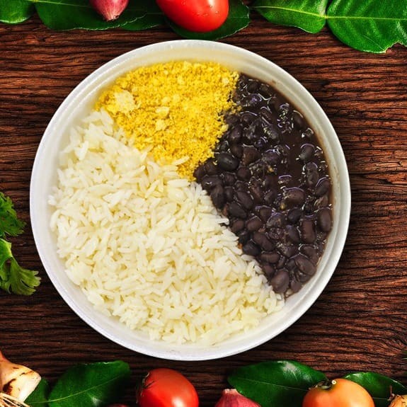 Arroz, Feijão, Farofinha temperada e 2 Ovos Cozidos (Peso total 350g). Atenção: Utilizamos Bacon no tempero do feijão e farofa.