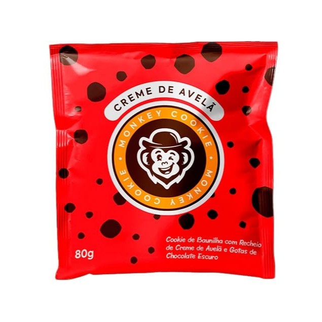 Cookie de Baunilha com Recheio de Creme de Avelã e Gotas de Chocolate Escuro - Monkey Cookie 80g. Produto Industrializado. (Sugestão: Dê uma aquecidinha rápida no microondas e prove pra vc ver!!! Fica Perfeito)