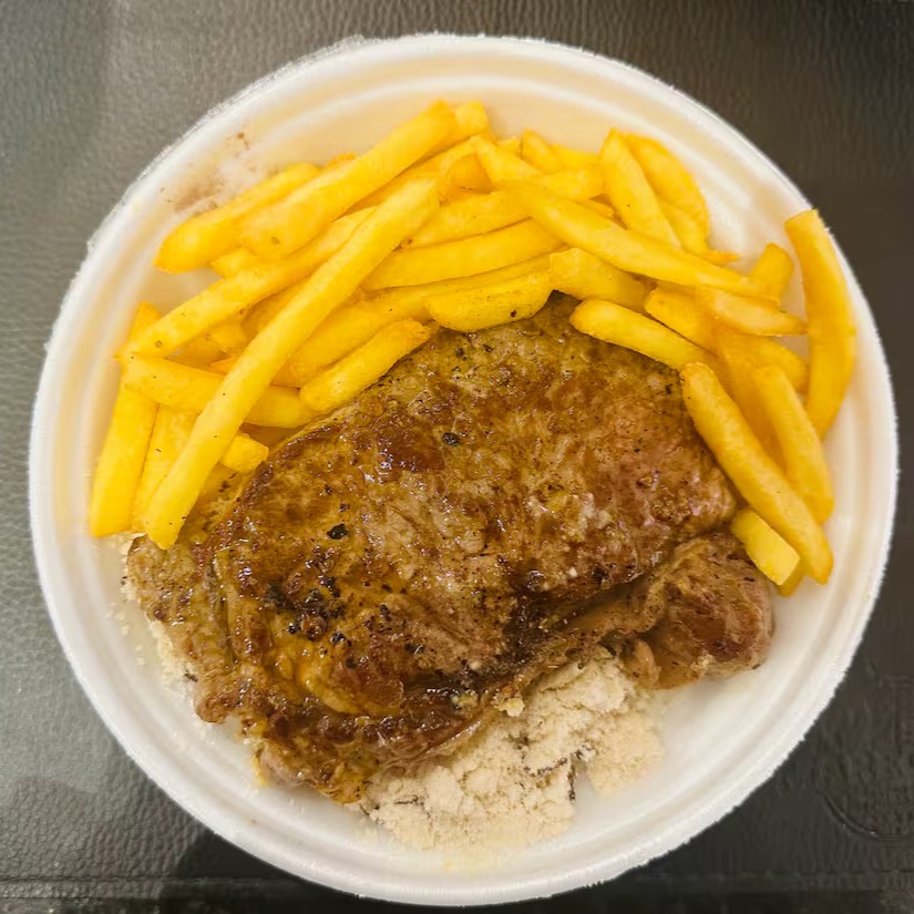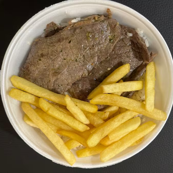 Contra Filé Sem Osso + Arroz + Maionese + Salada + Farofa + Fritas .