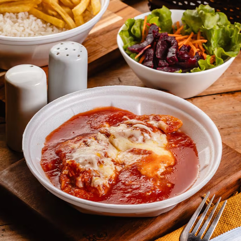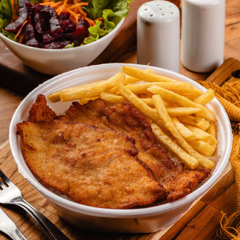Arroz, fritas, maionese, salada, farofa ou banana á milanesa. Serve 2 pessoas