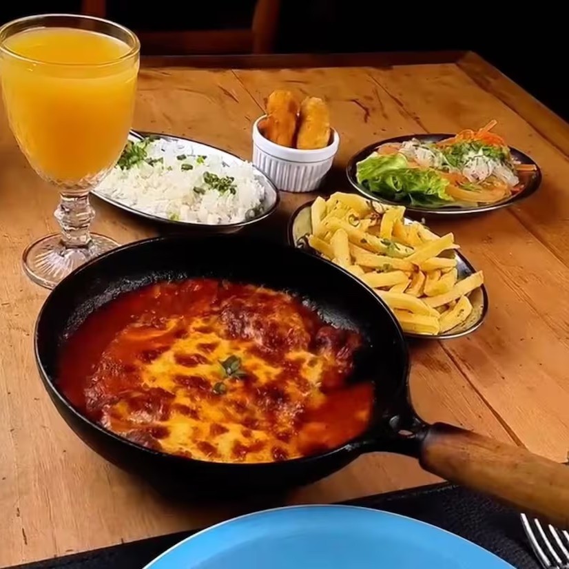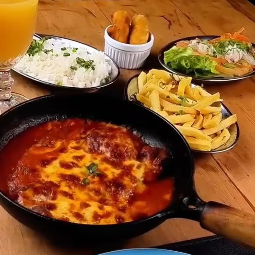 Arroz, fritas, maionese, salada, farofa ou banana á milanesa. Serve 2 a 4 pessoas