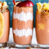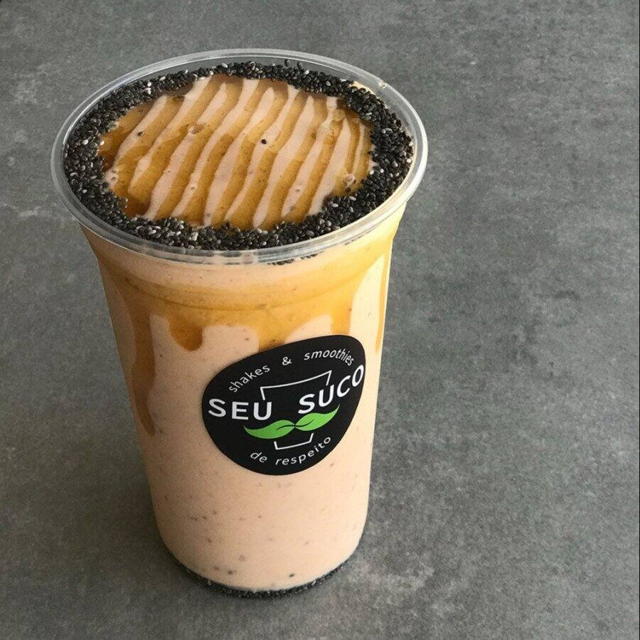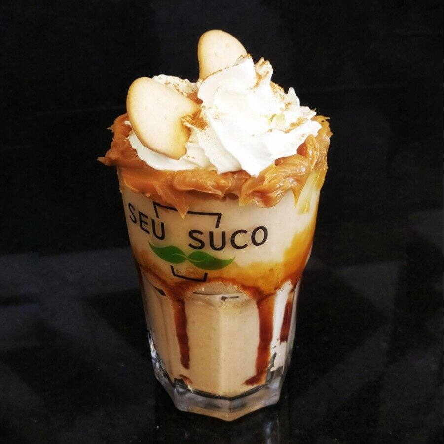 Delicioso smoothie com base de banana e pasta de amendoim e recheio de paçoca com amendoim. 500 Ml