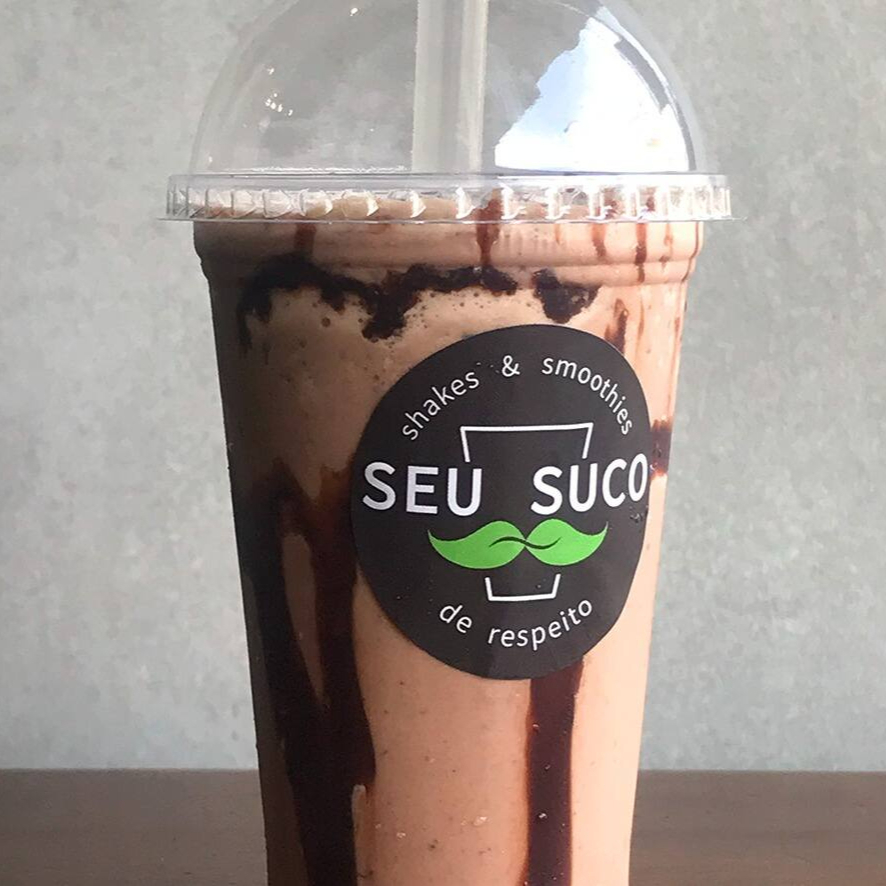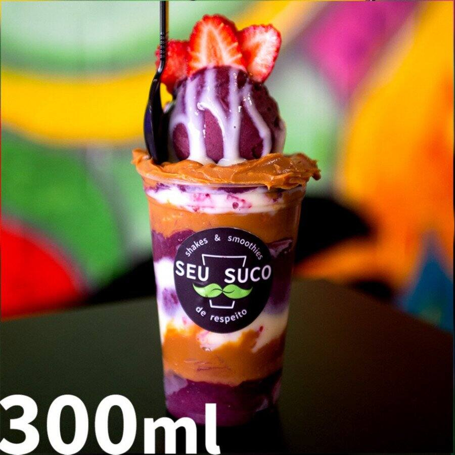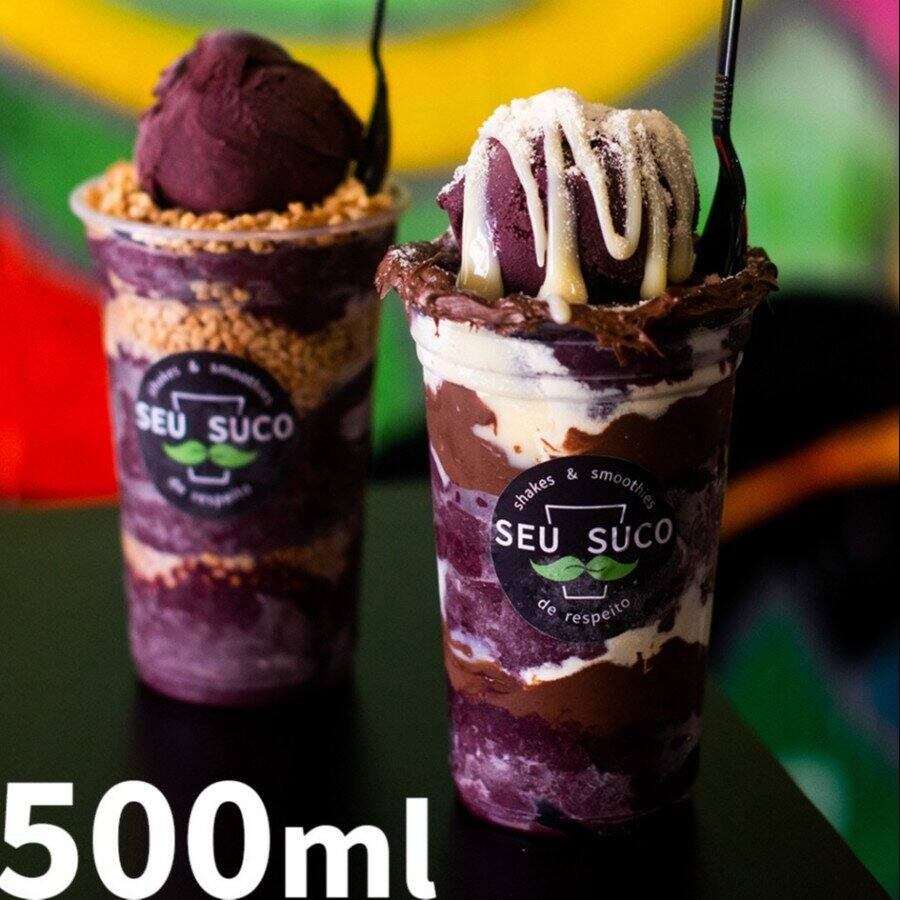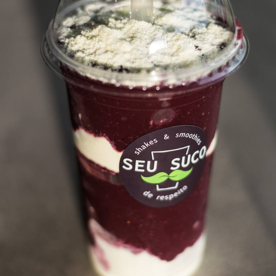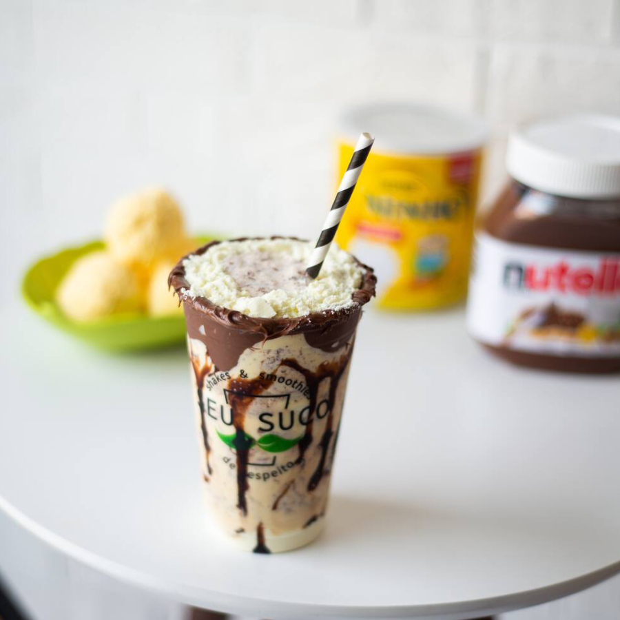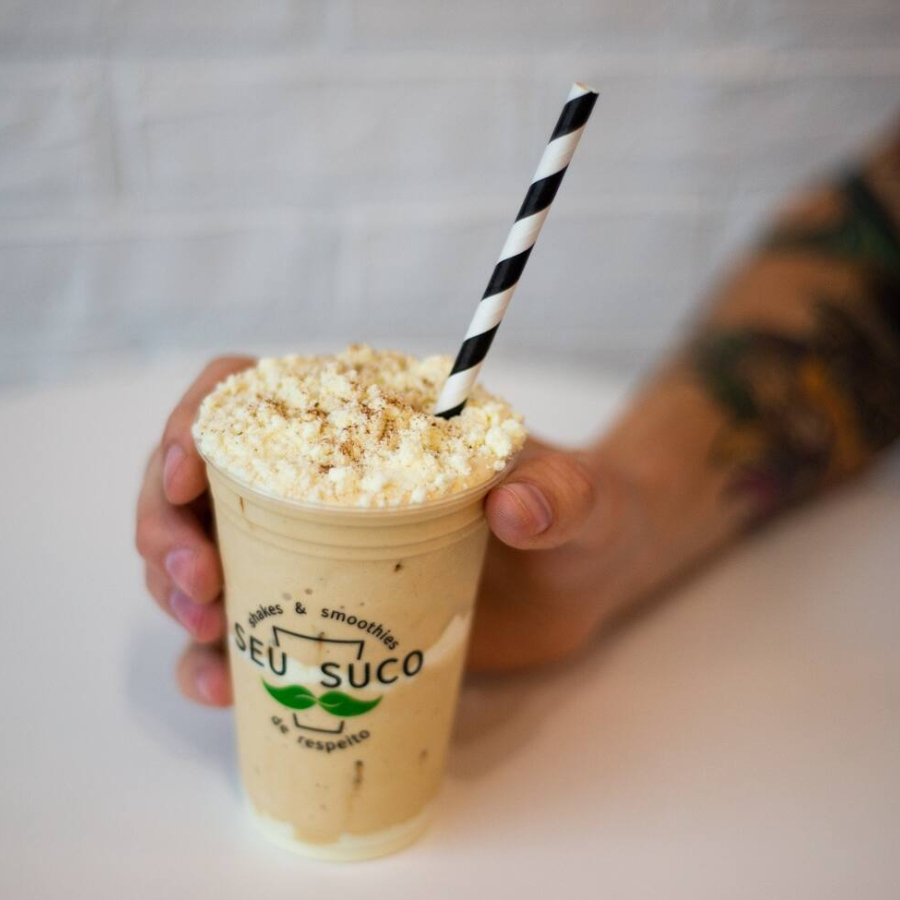 Nosso shake com leite, açaí, paçoca e leite Ninho