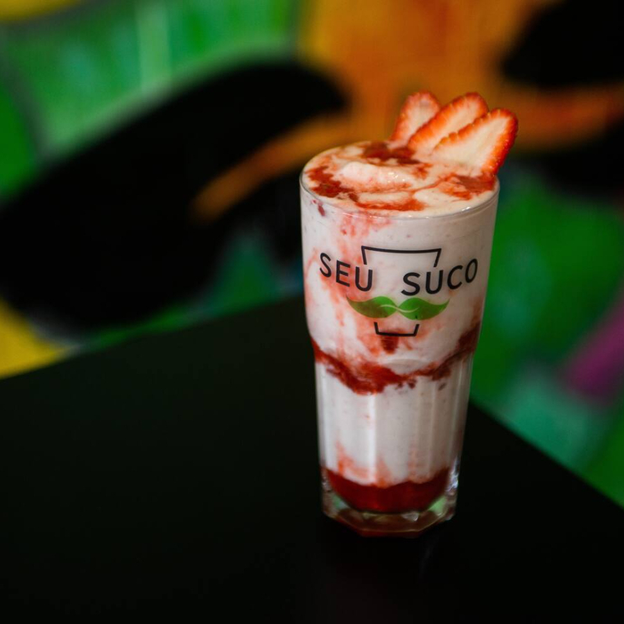 Delicioso milkshake feito com morango, leite e sorvete artesanal.