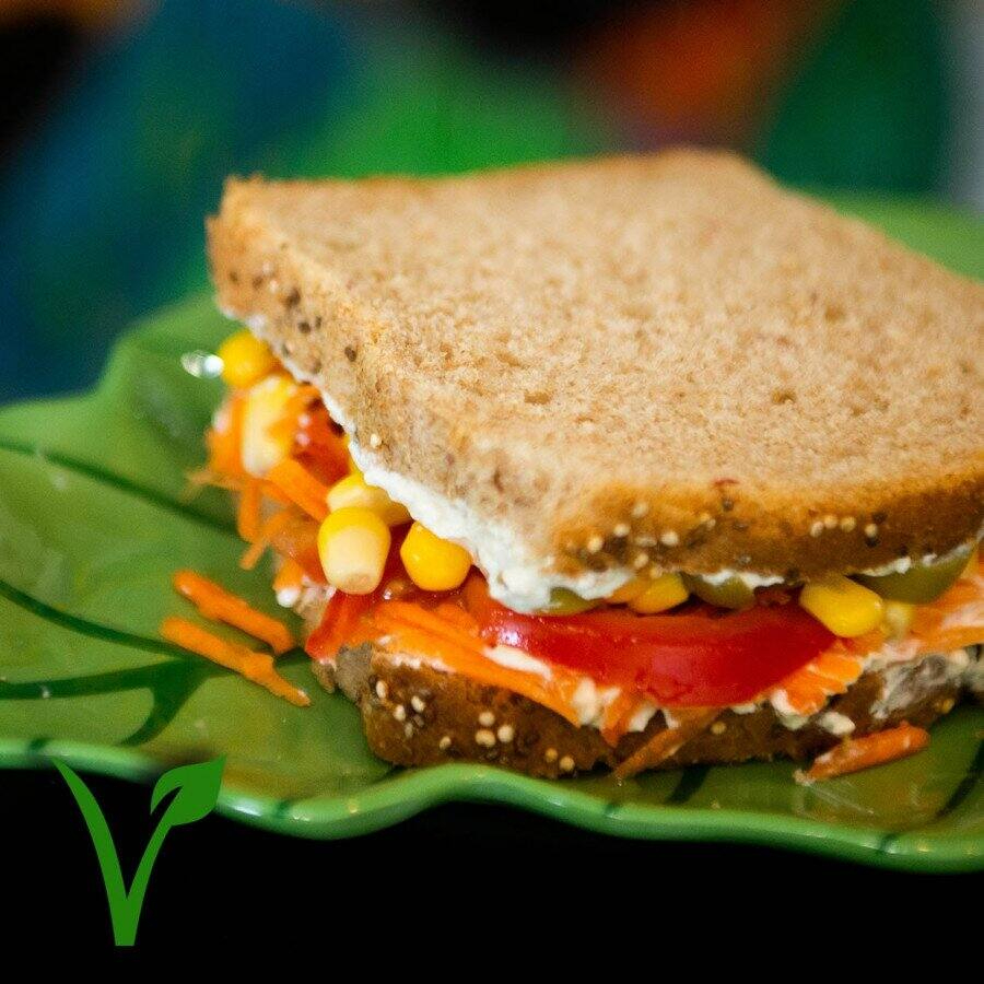 Sandubão com pão 100% integral, sour cream de tofu, cenoura, milho, tomate e azeitona. (vegano)