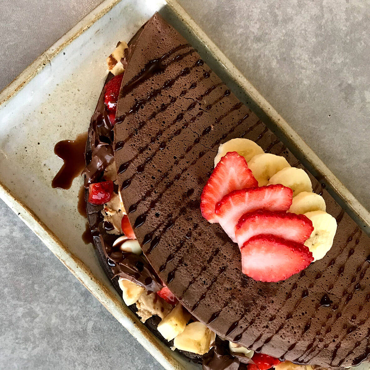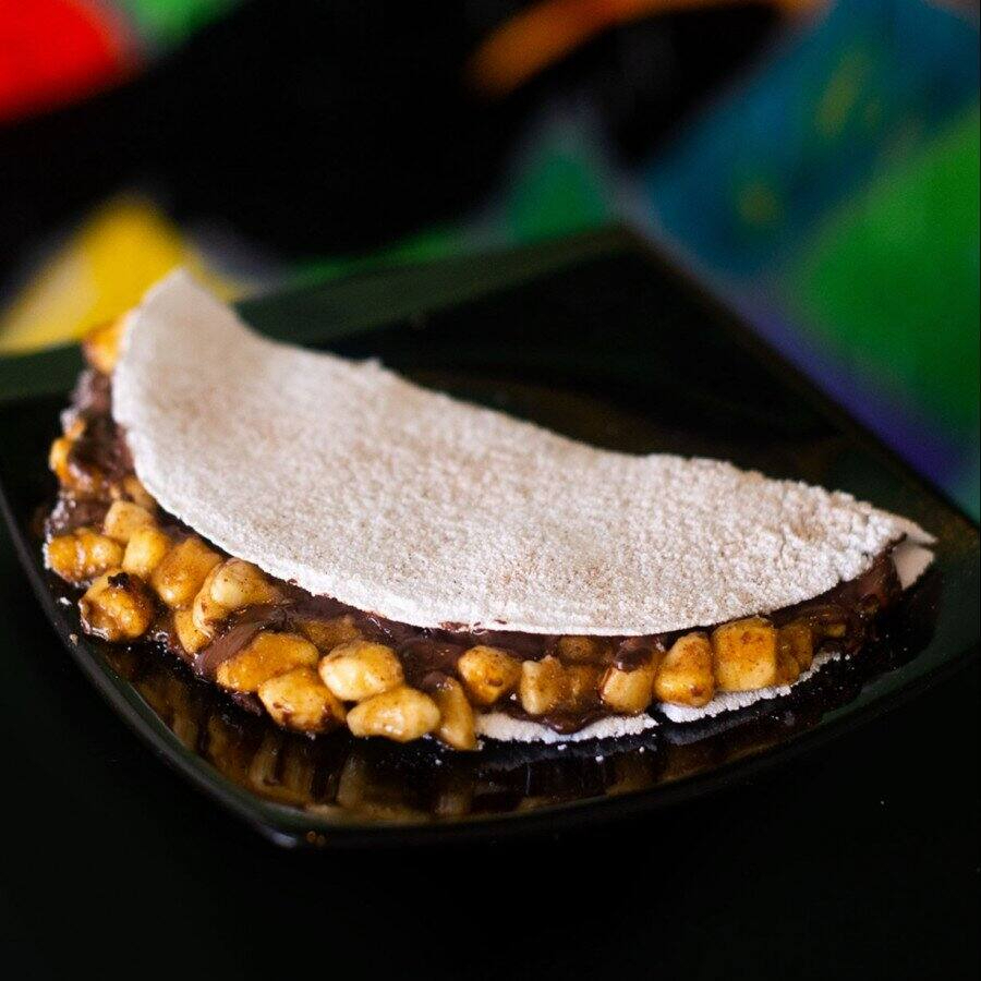 Crepioca com banana caramelizada, chocolate e canela. Inspirada numa receita tradicional de família