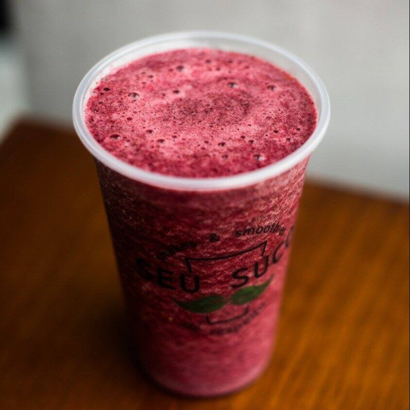 Um dos shakes mais pedidos! Feito com leite de castanha, morango, blueberry e banana. (vegano)