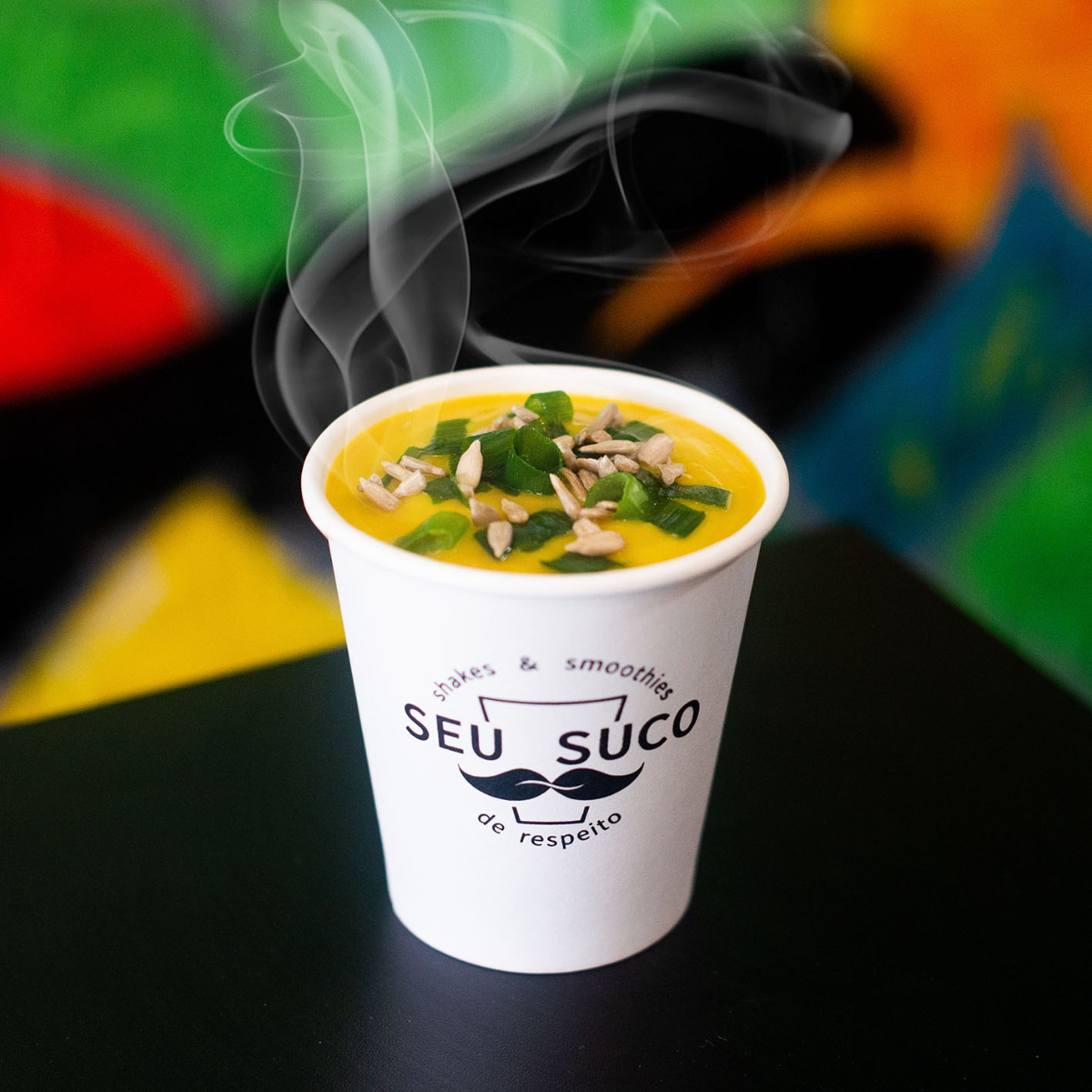 A sopa cremosa de abóbora do Seu Suco! Saudável e deliciosa, vai te aquecer mais do que pular num show de rock. *feita com ingredientes naturais. Vegana. Servida no copo de 300ml