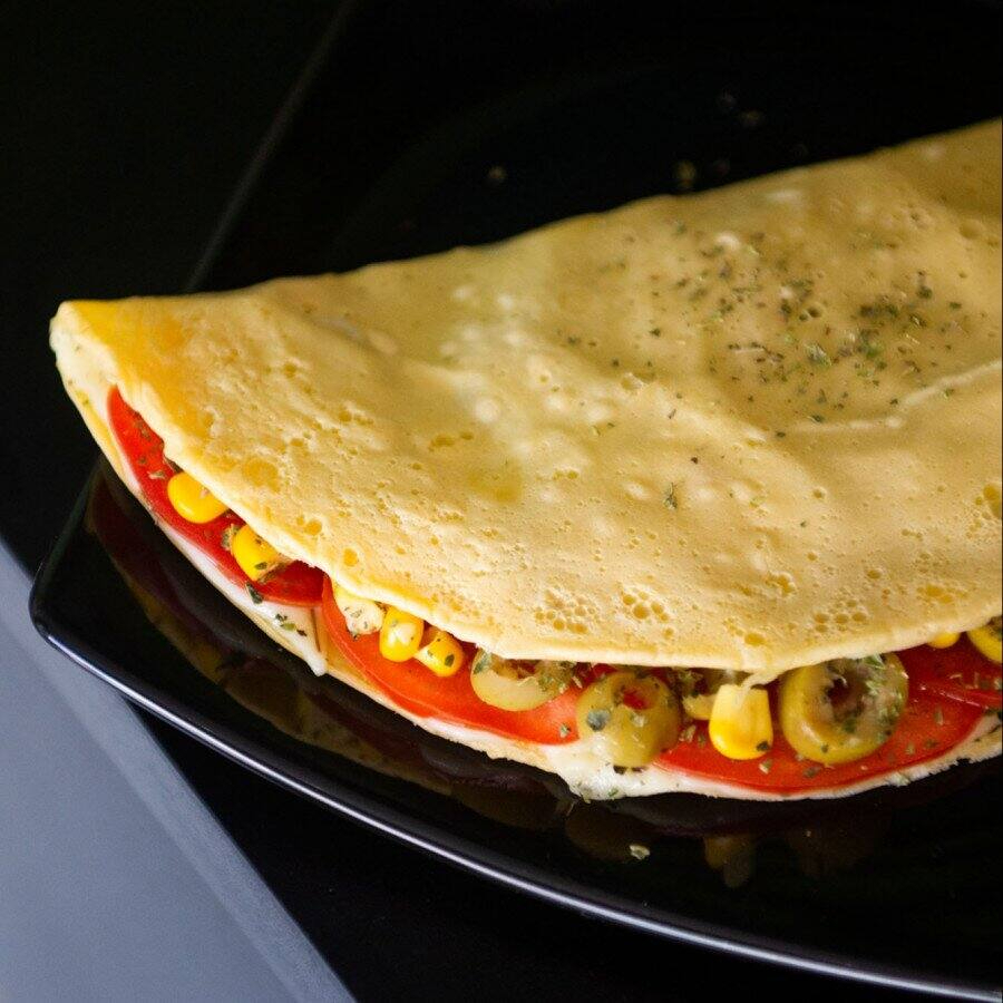 Crepioca com queijo ou sour cream + tomate + milho + azeitona + orégano. Gostinho de pizza! *Colocar na observação do pedido se quer queijo ou sour cream*