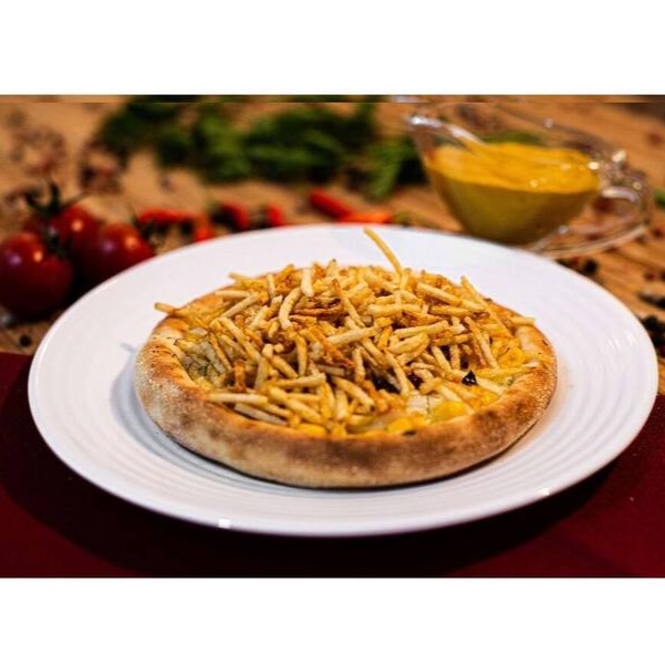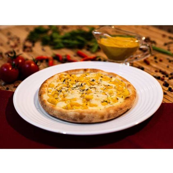 Mussarela, milho, bacon, requeijão, orégano e batata palha