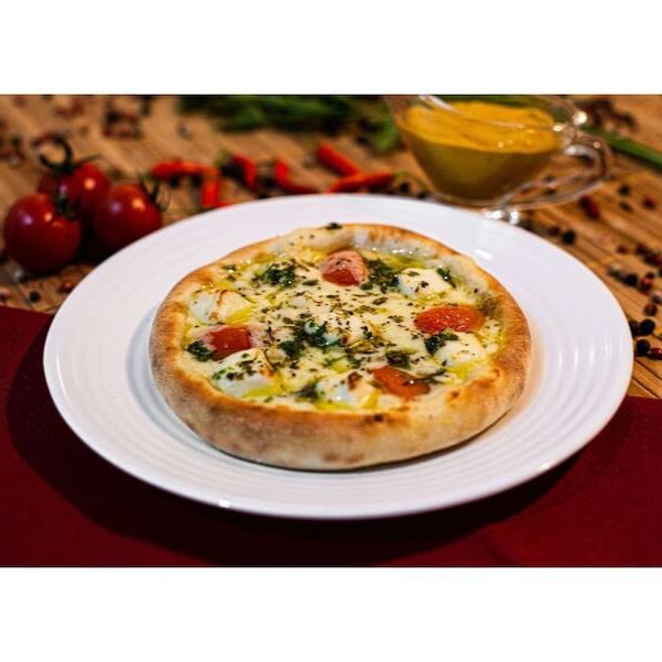 Mussarela, queijo branco, tomate cereja, molho pesto e orégano.