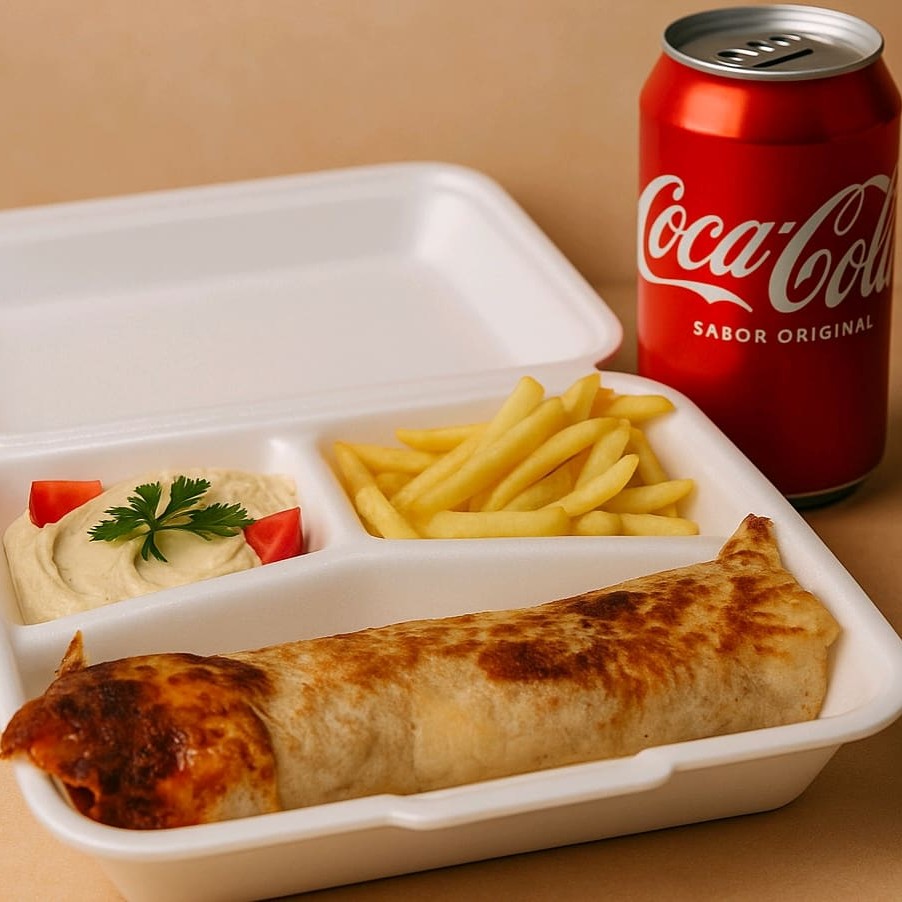 Combo Gringo, Escolha seu Shawarma Preferido. Pão folha recheado com 150g de suculento frango,carne ou misto temperado no estilo árabe, servido com 100g de batata frita crocante, 50g de homus cremoso e uma lata gelada de Coca-Cola. Sabor autêntico, porção generosa e frescor em cada mordida!