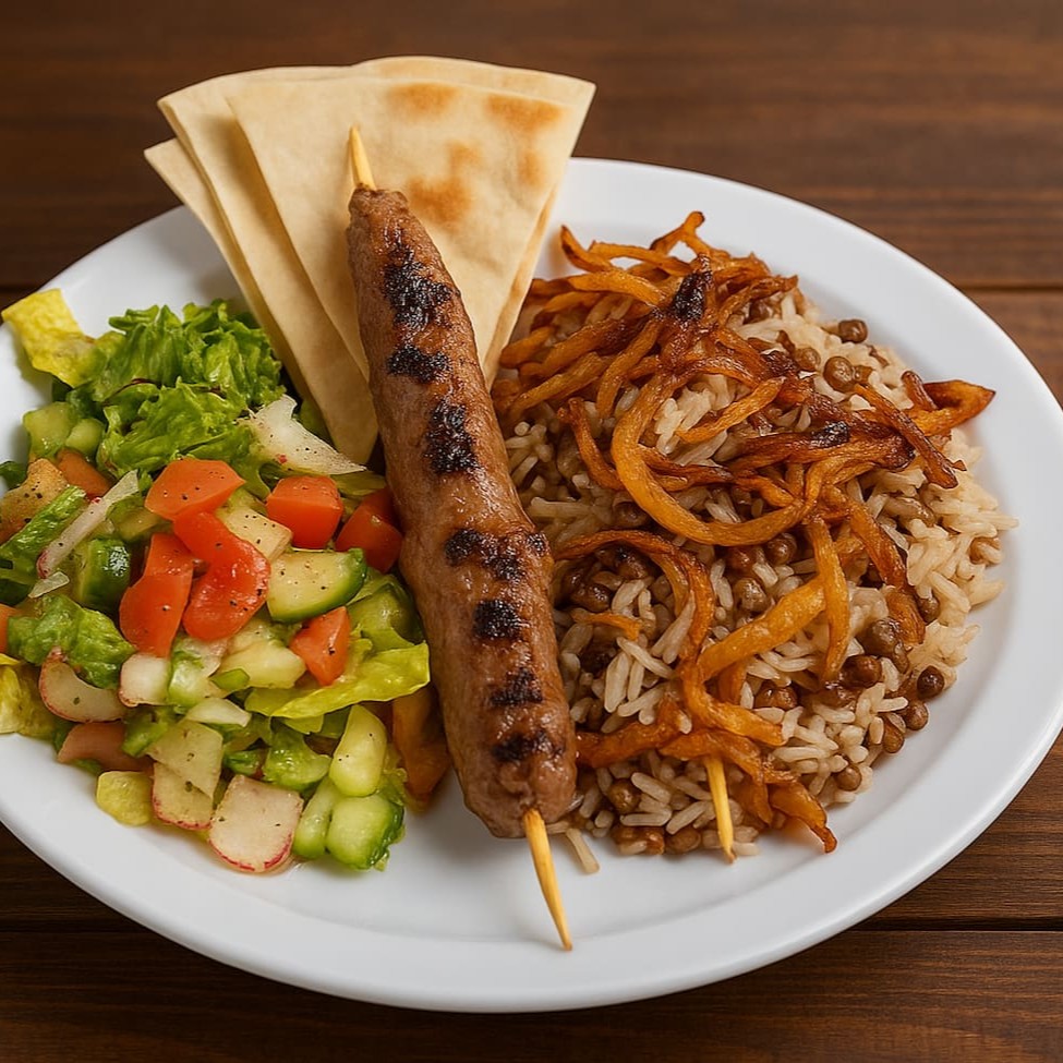 Prato Árabe: Mujadra com Kafta Delicioso prato de arroz com lentilhas (mujadra) servido com um espetinho de kafta bovina grelhada, salada fresca no estilo árabe (tomate, pepino,alface , hortelã e limão) e pão sírio artesanal. Uma combinação leve, nutritiva e cheia de sabor do Oriente Médio!