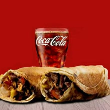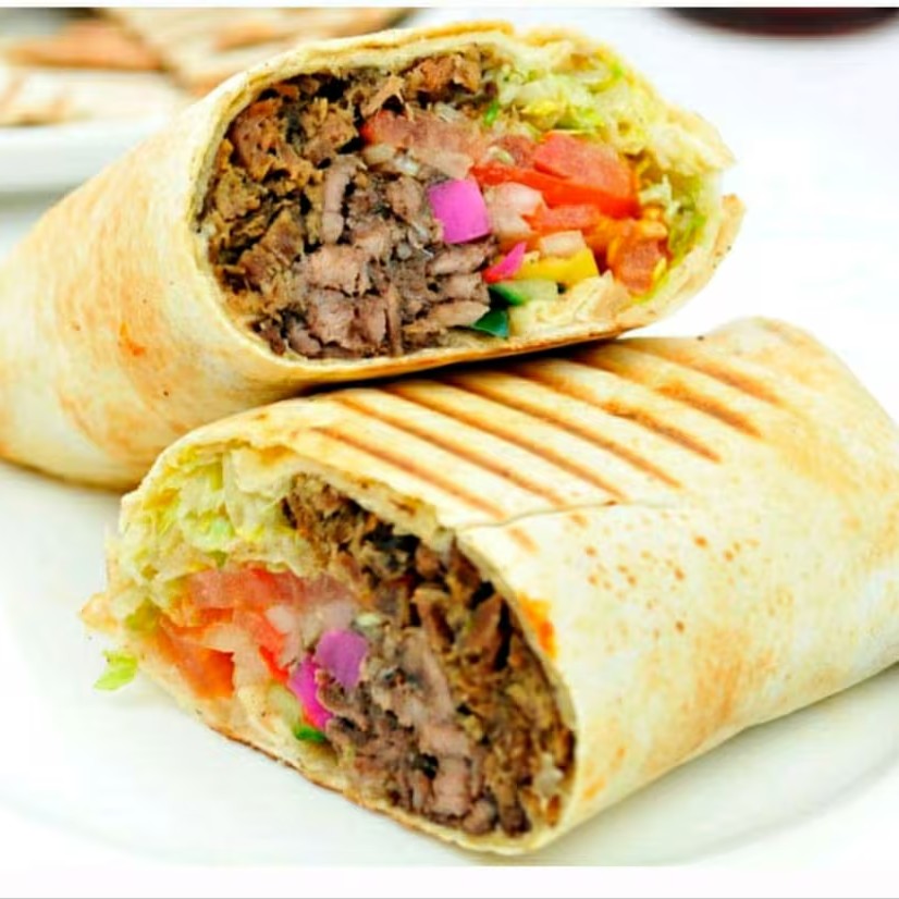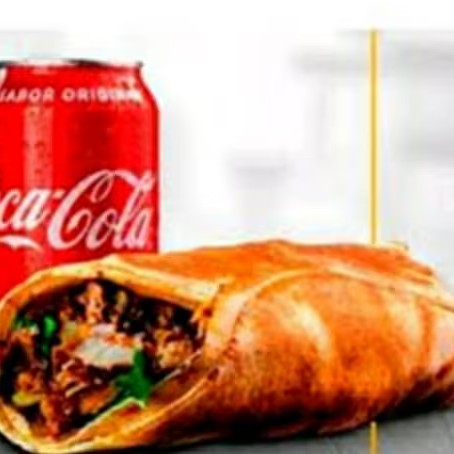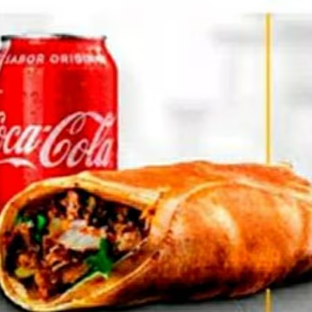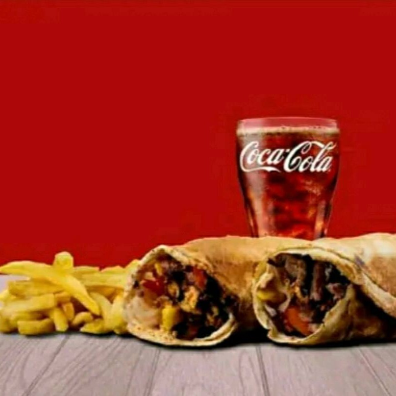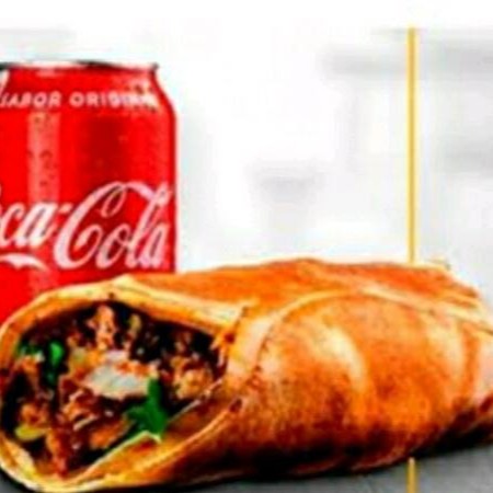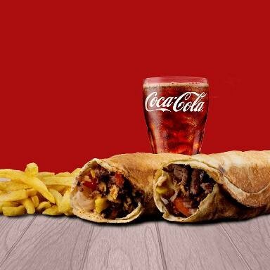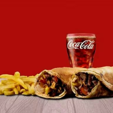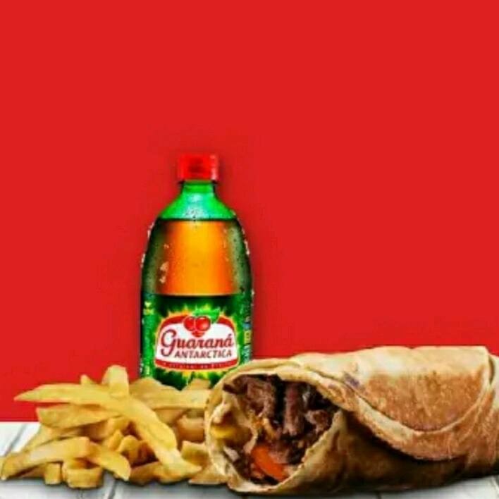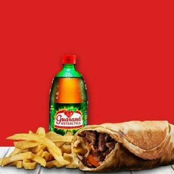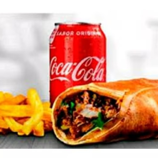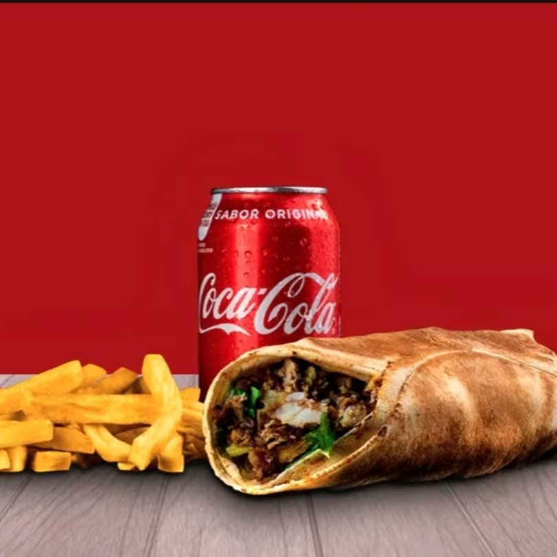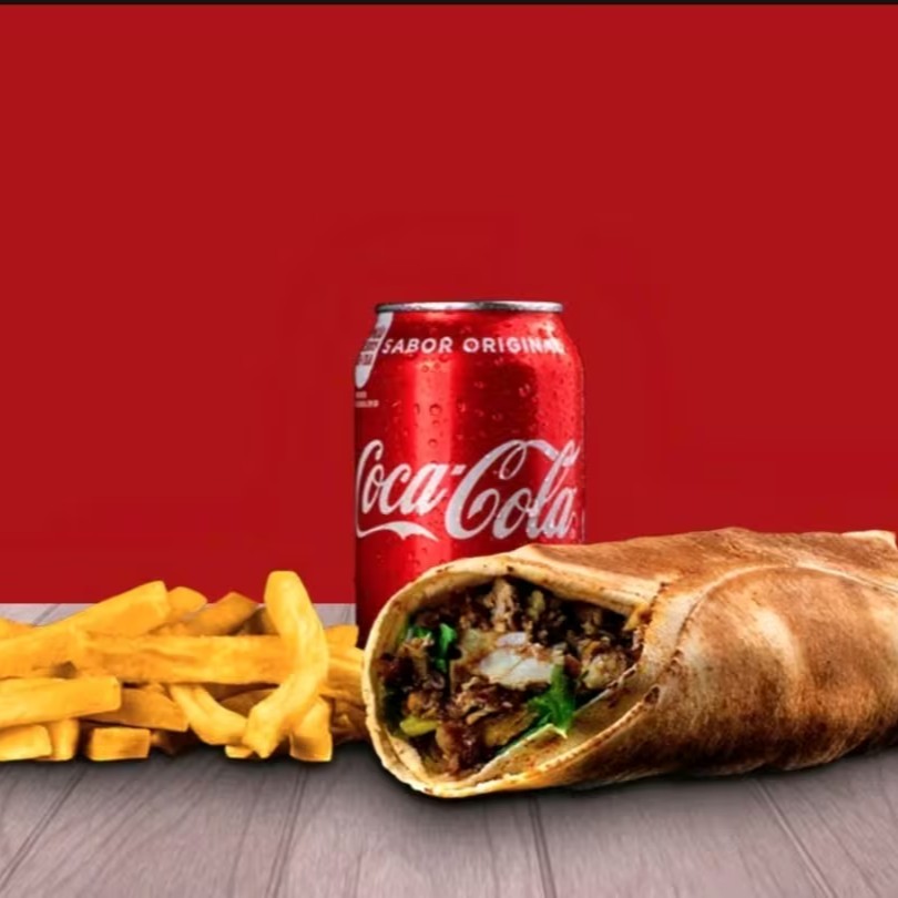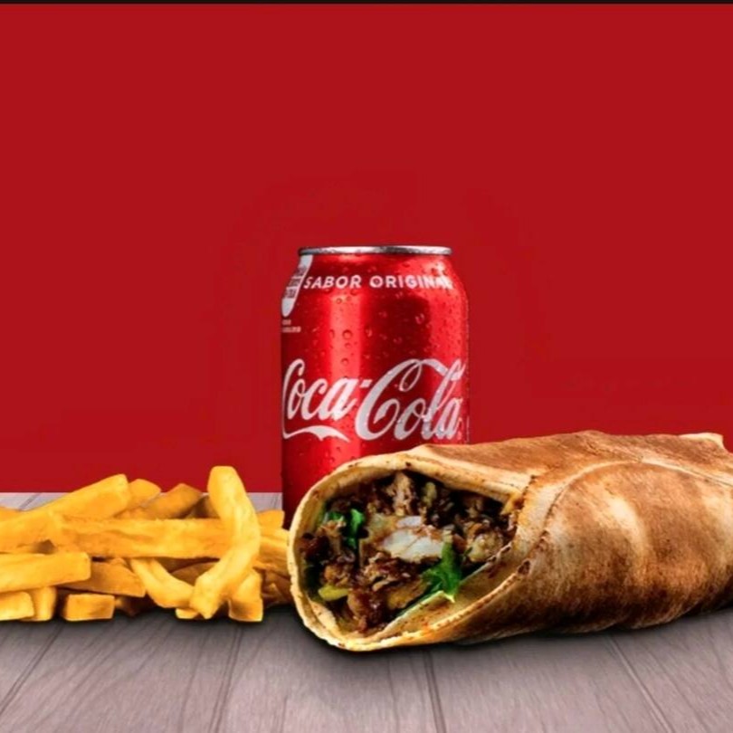 Pão Sírio ( massa deliciosa) Recheado com tiras de carne temperado com nossos temperos tradicionais,tomate,cebola,alface,salsinha,creme de alho,batata frita ( Dentro) + um refrigerante lata