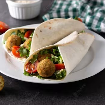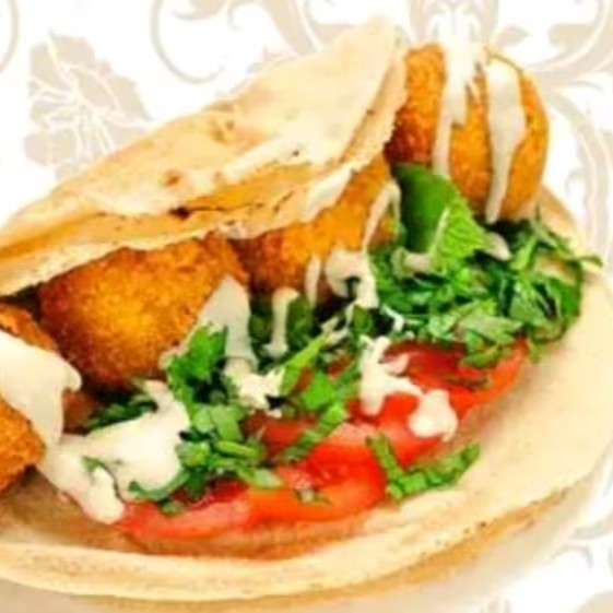 Pão sírio molho de alho da casa,alface ,tomate batata fritas temperada com tempero da casa bolinho de Falafel salsinha