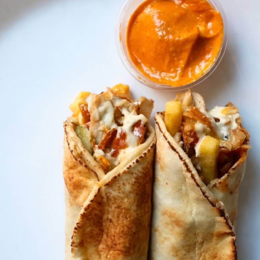 Pão sírio,creme de alho tradicional da casa ,tomate,cebola,alface salsinha tiras de frango , batata fritas temperadas com tempero da casa