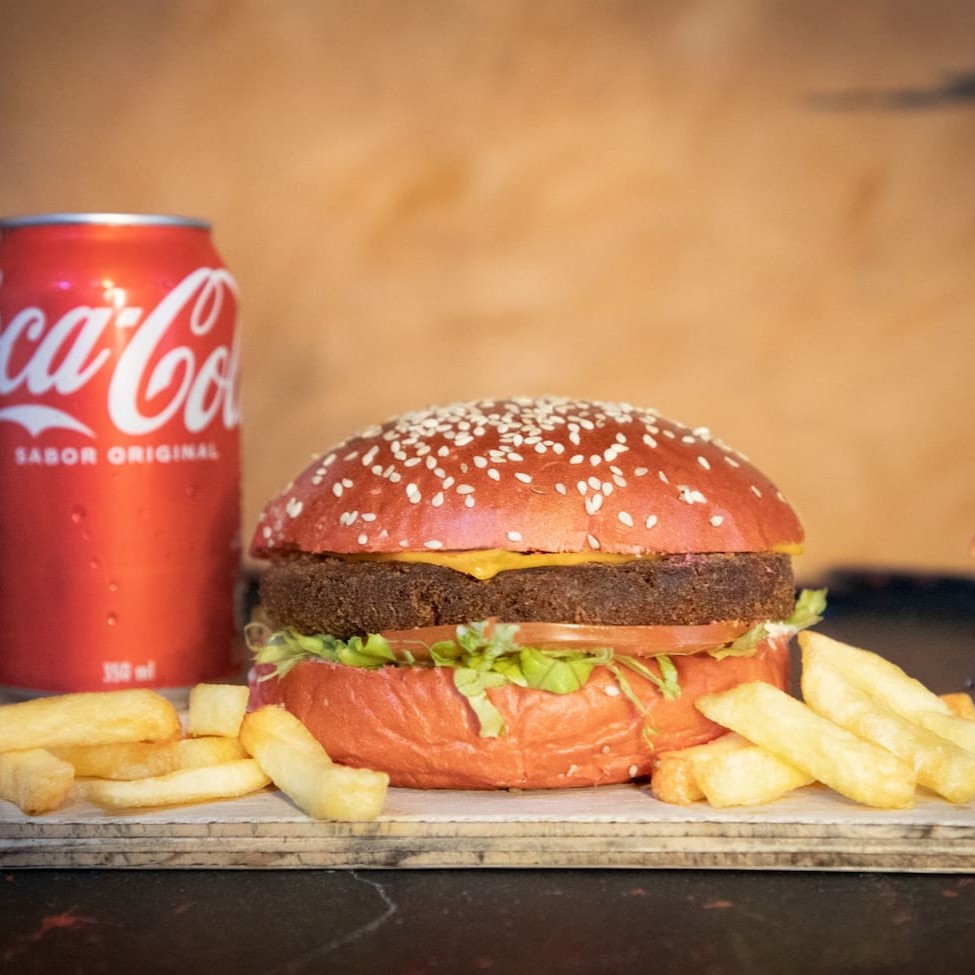1 Hambúrguer Sakura - Pão Brioche, steak artesanal vegetariano 120g frito, cogumelo paris salteado no shoyu, maionese, queijo mussarela, alface e tomate + 1 porção de 250gr de Batata frita palito e um refrigerante