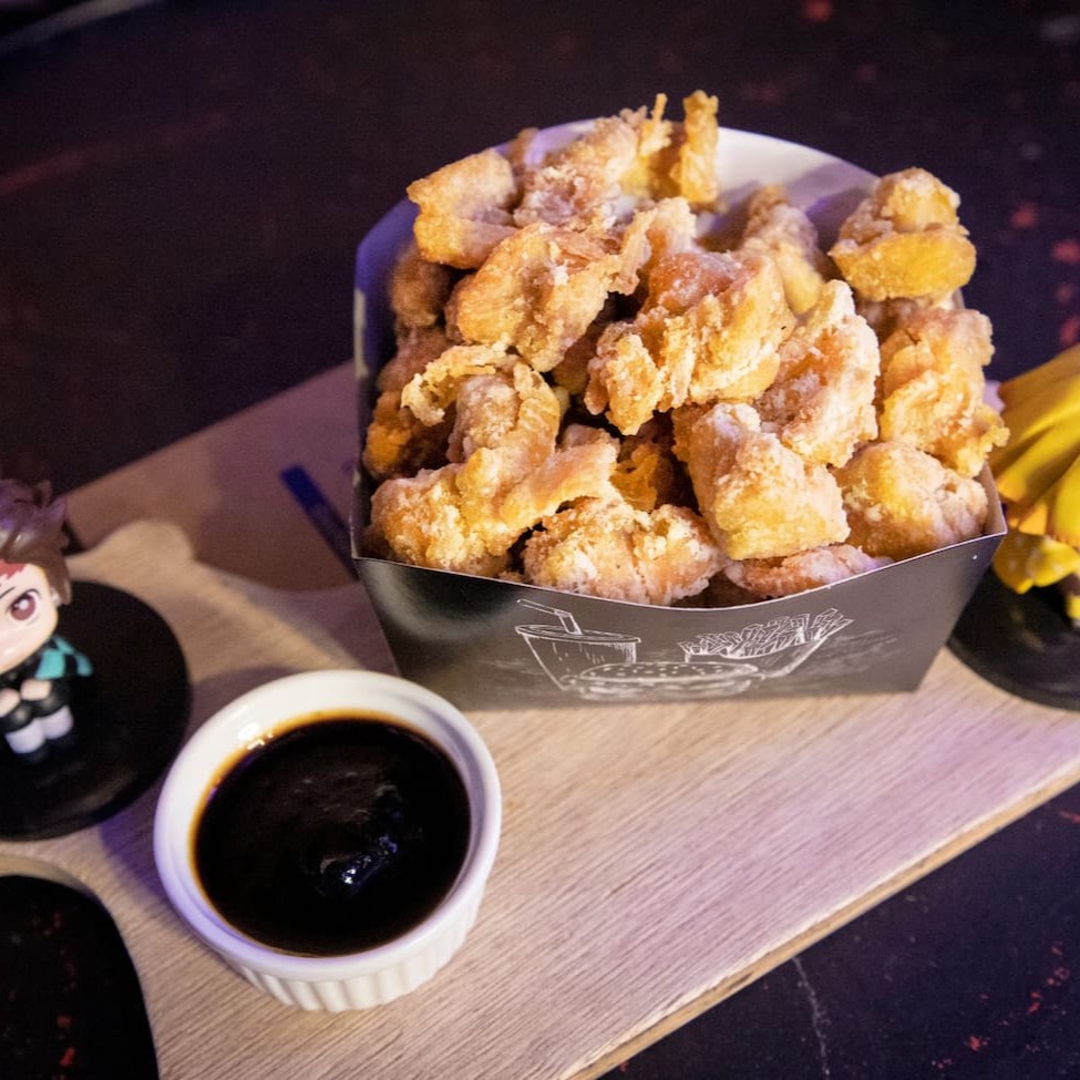 Porção de frango frito no estilo karaage de 400g - Tiras de sobre coxa marinada no sake, temperada com curry, sal, pimenta do reino, alho, empanada e frita. Pote de Molho K-Pop - Molho Agridoce Picante (Gochujang* pimenta coreana, shoyu, sake mirin, açucar, ketchup, alho e cebola)