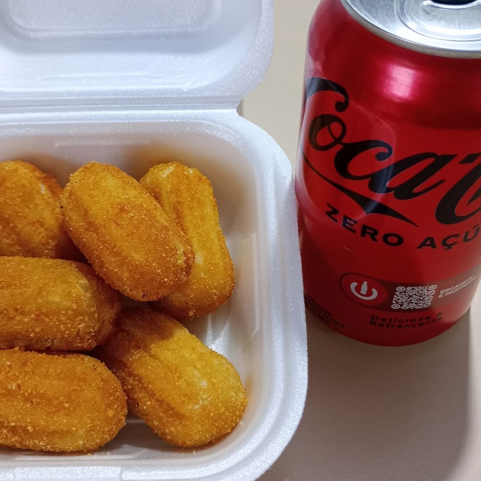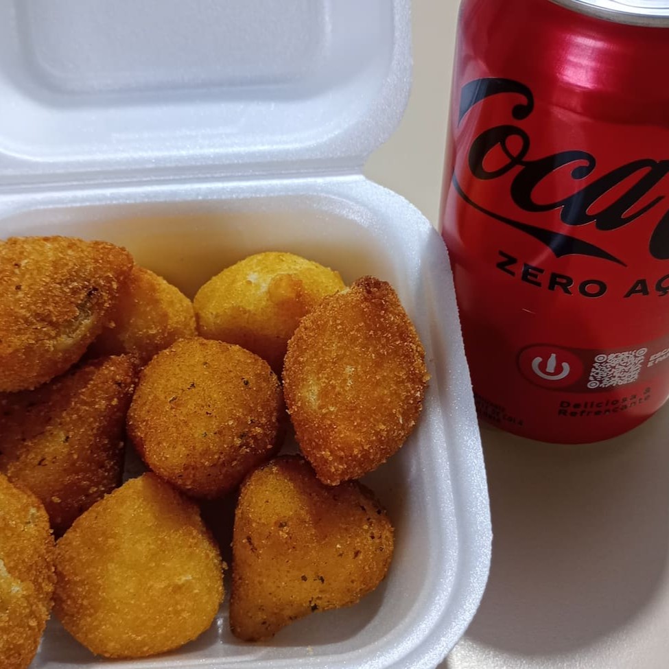 3 mini coxinhas de frango, 3 mini coxinhas de frango com requeijão, 3 mini trouxinhas de carne total 230 gramas. Uma coca 350ml normal ou 0 ------ tags ----- Salgados mini salgados fritos refrigerante bebidas bolo caseiro bolo de pote geladinho gourmet sorvete pudim sobremesa chocolate promoção cupom de desconto taxa grátis ganhe frete