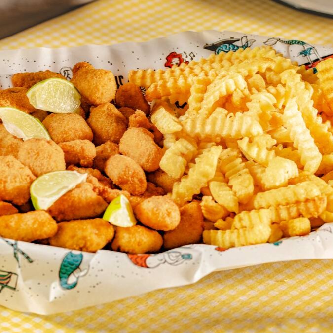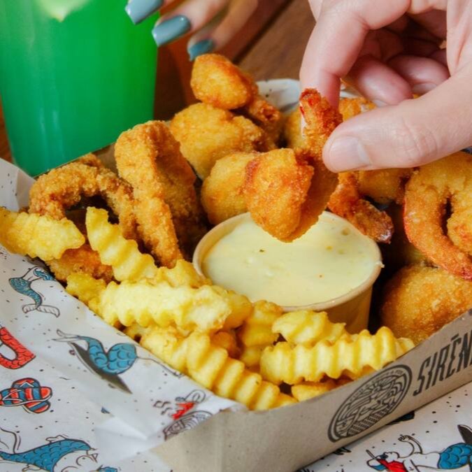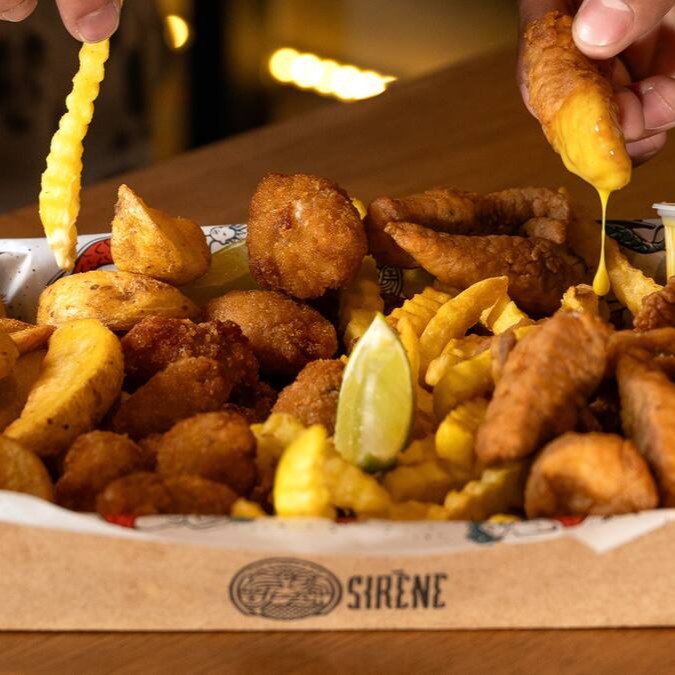 Combinado de iscas de tilápia empanadas no trigo, tiras de peixe branco empanadas na Panko, batatas rústicas e crinkle, e tempero especial Sirène. Acompanha quatro molhos à sua escolha. (1kg*)